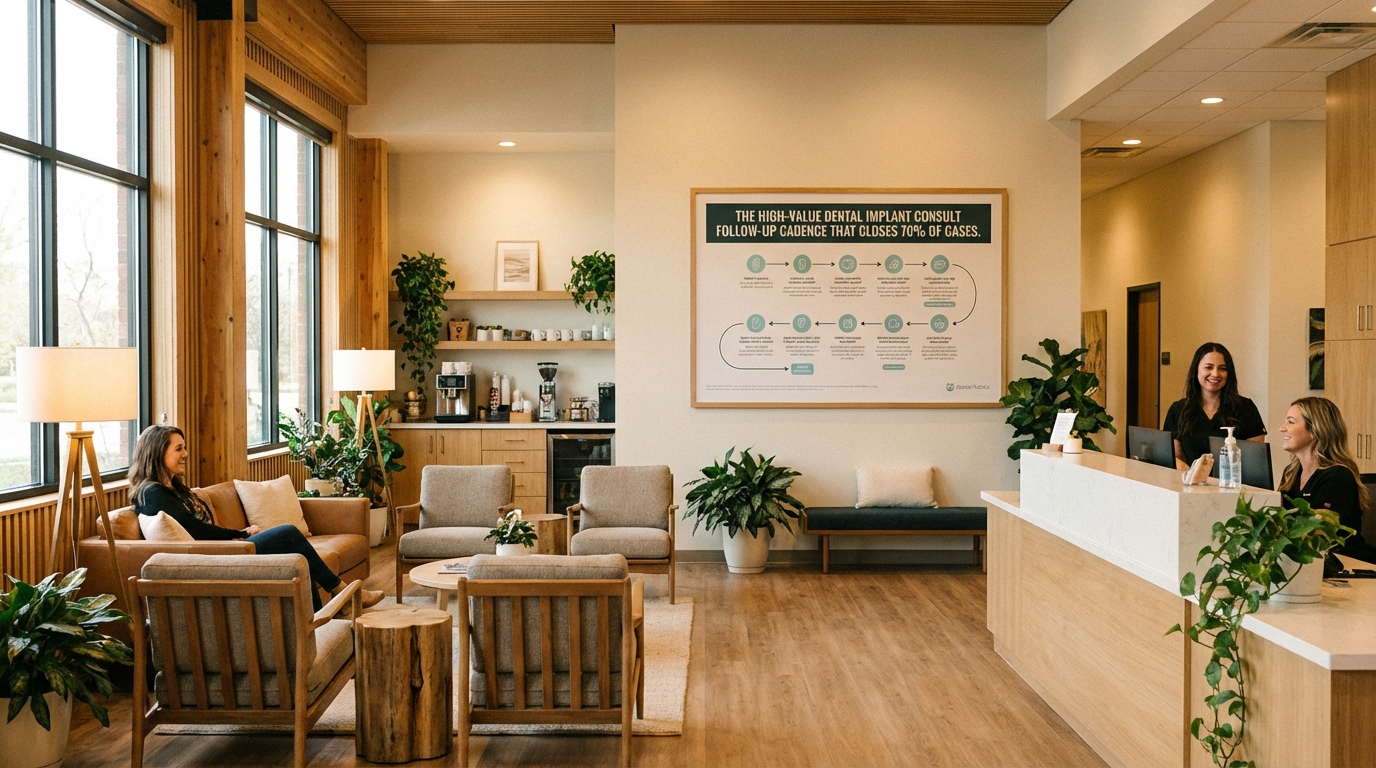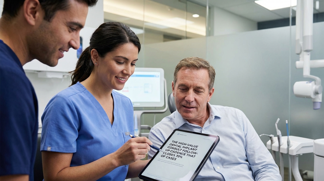 A repeatable follow-up cadence keeps implant consults moving from "maybe" to "yes" without adding more people to the team. Instead of relying on memory or reactive outreach, design a sequence that combines timely reminders, social proof, and human touchpoints. This cadence becomes part of the broader Dental Implant Case Acceptance Sales System so treatment coordinators never miss a beat.