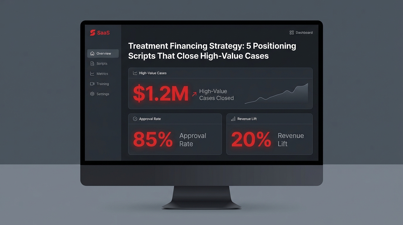 Track case acceptance rate, percentage of patients choosing financing, average monthly payment, third-party approval rate, and recovered cases after follow-up. When scripts stick, you’ll see acceptance rise 20+ points, abandoned cases drop below 10%, and average monthly payments stabilize within a narrow band.